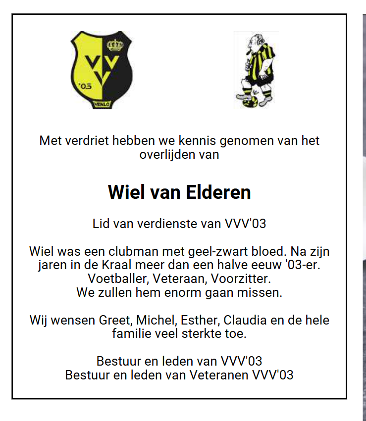 Vrijdag 3 april jl. is Wiel van Elderen overleden, op 83-jarige leeftijd. Hij sukkelde al eventjes met zijn gezondheid, maar toch was hij nog geregeld op de Berg aanwezig. Meestal was dat bij wedstrijden of activiteiten van de veteranen, eigenlijk altijd met zijn goede vriend Frans Gooren. Zijn betrokkenheid bij onze club was natuurlijk al veel ouder, Wiel was al 54 jaar lid. En in die periode heeft hij zijn sporen verdiend, hij was niet voor niets Lid van Verdienste.